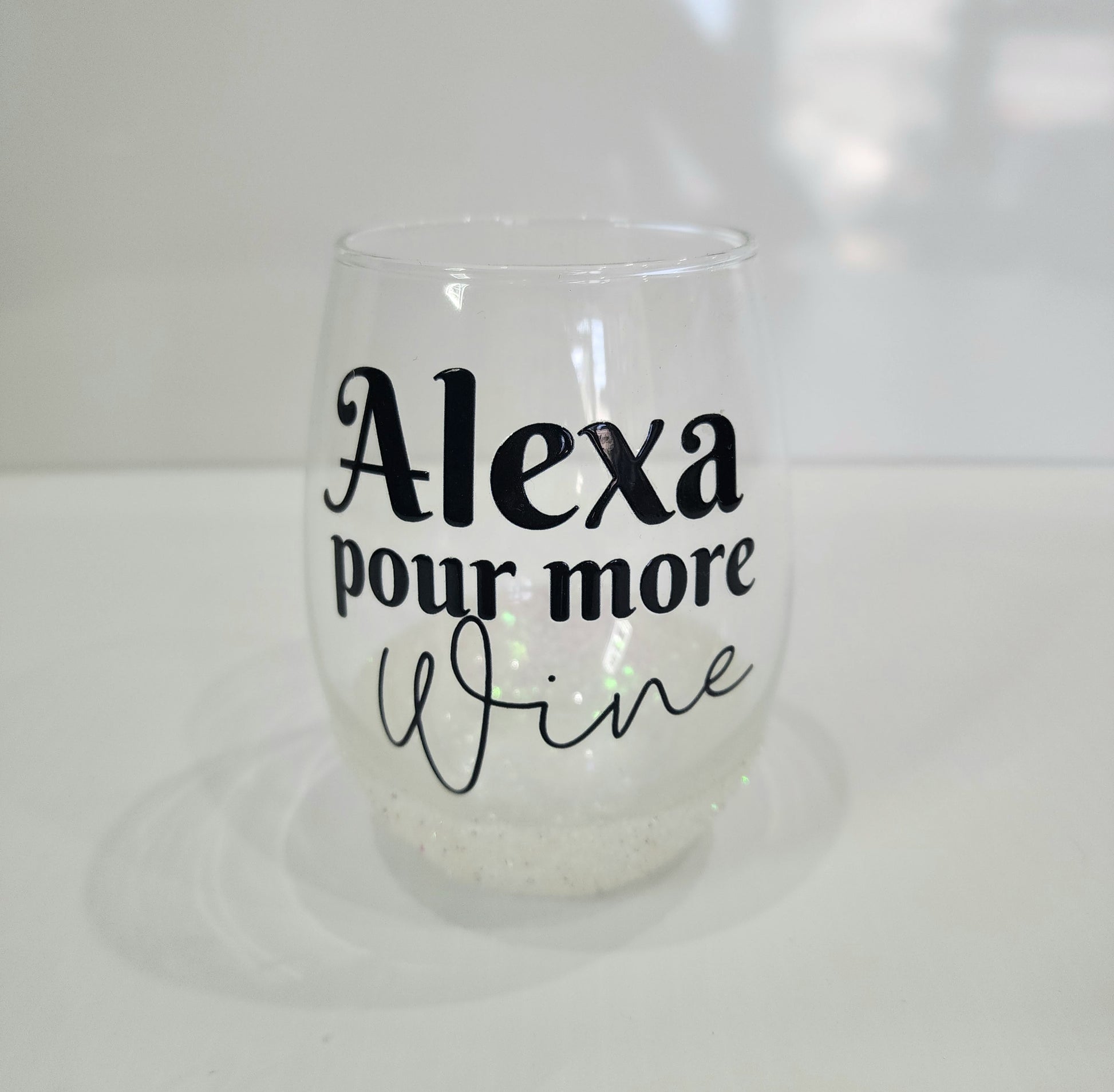 Pour in the fun with our 'Alexa Pour More Wine' cup! Featuring a sleek design with glitter at the base, this cup adds a touch of sparkle to your wine moments. Sealed for waterproof protection and customizable with your favorite glitter color.