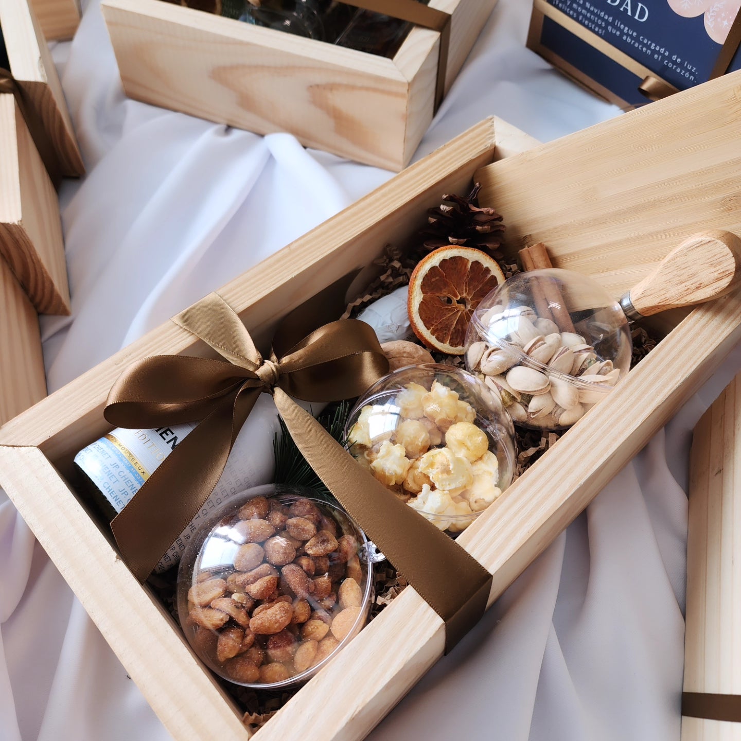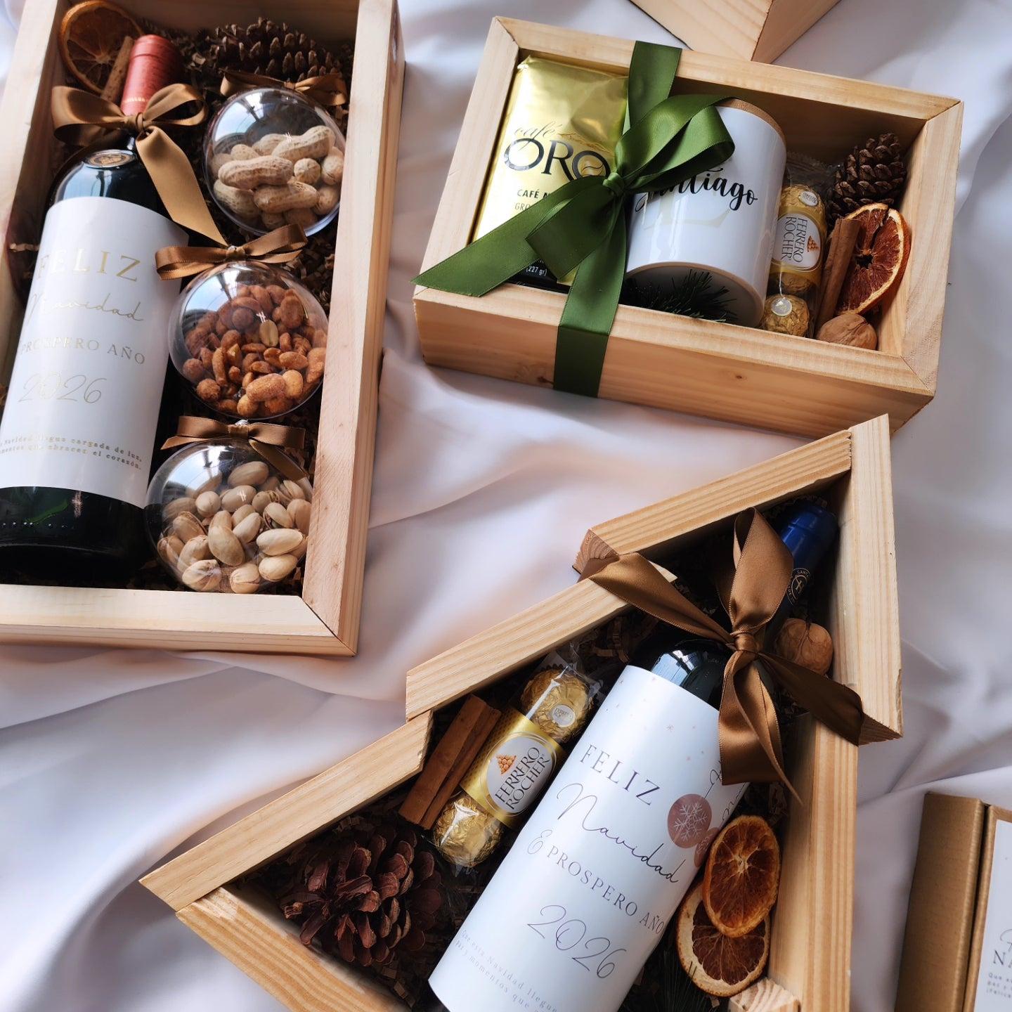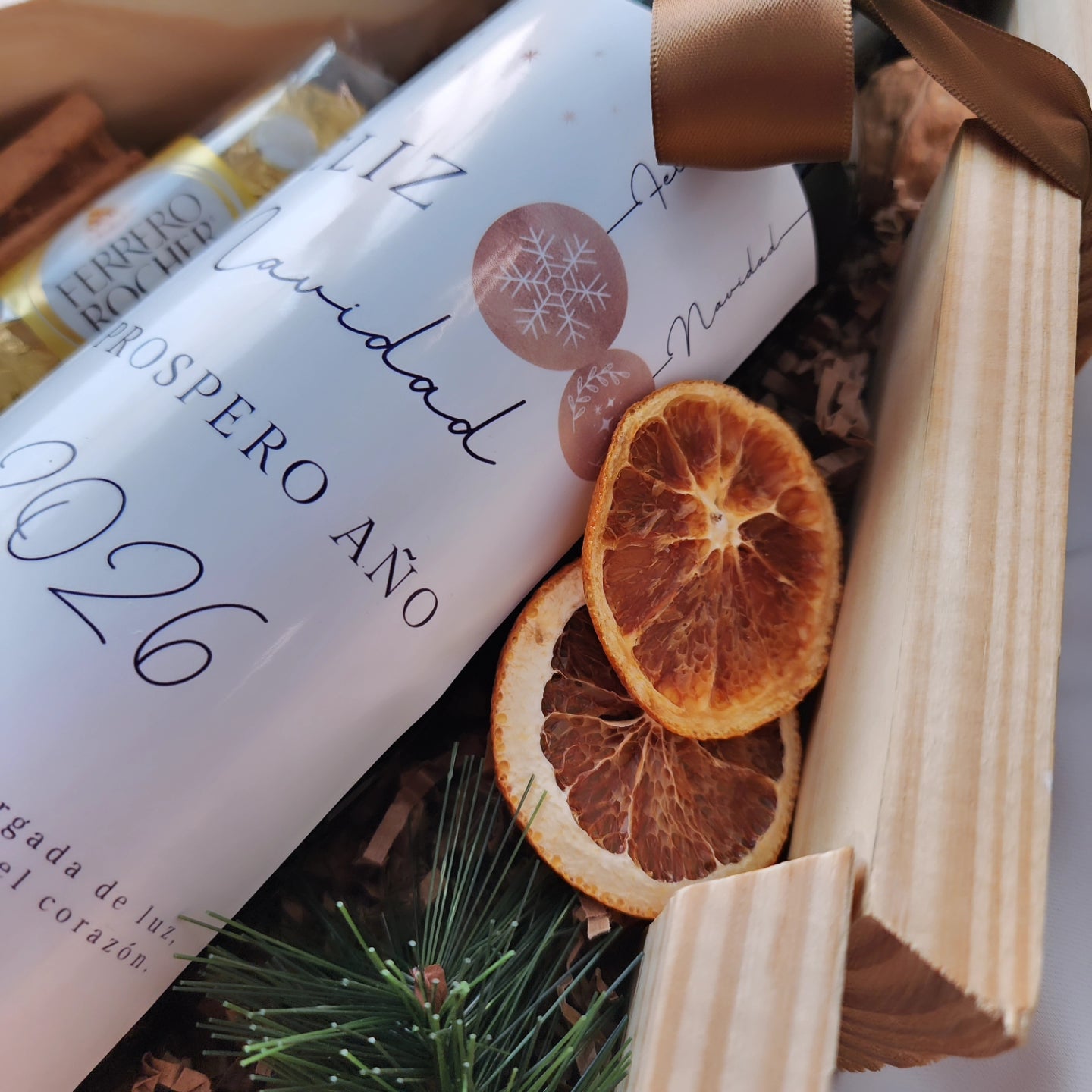 Este año apostamos por una paleta neutral, cálida y sofisticada, combinada con acentos en madera que realzan cada detalle. Cada pieza fue pensada y creada meticulosamente, desde los lazos hasta las texturas, para lograr regalos que se sienten elegantes, modernos y con ese toque acogedor que tanto nos gusta.