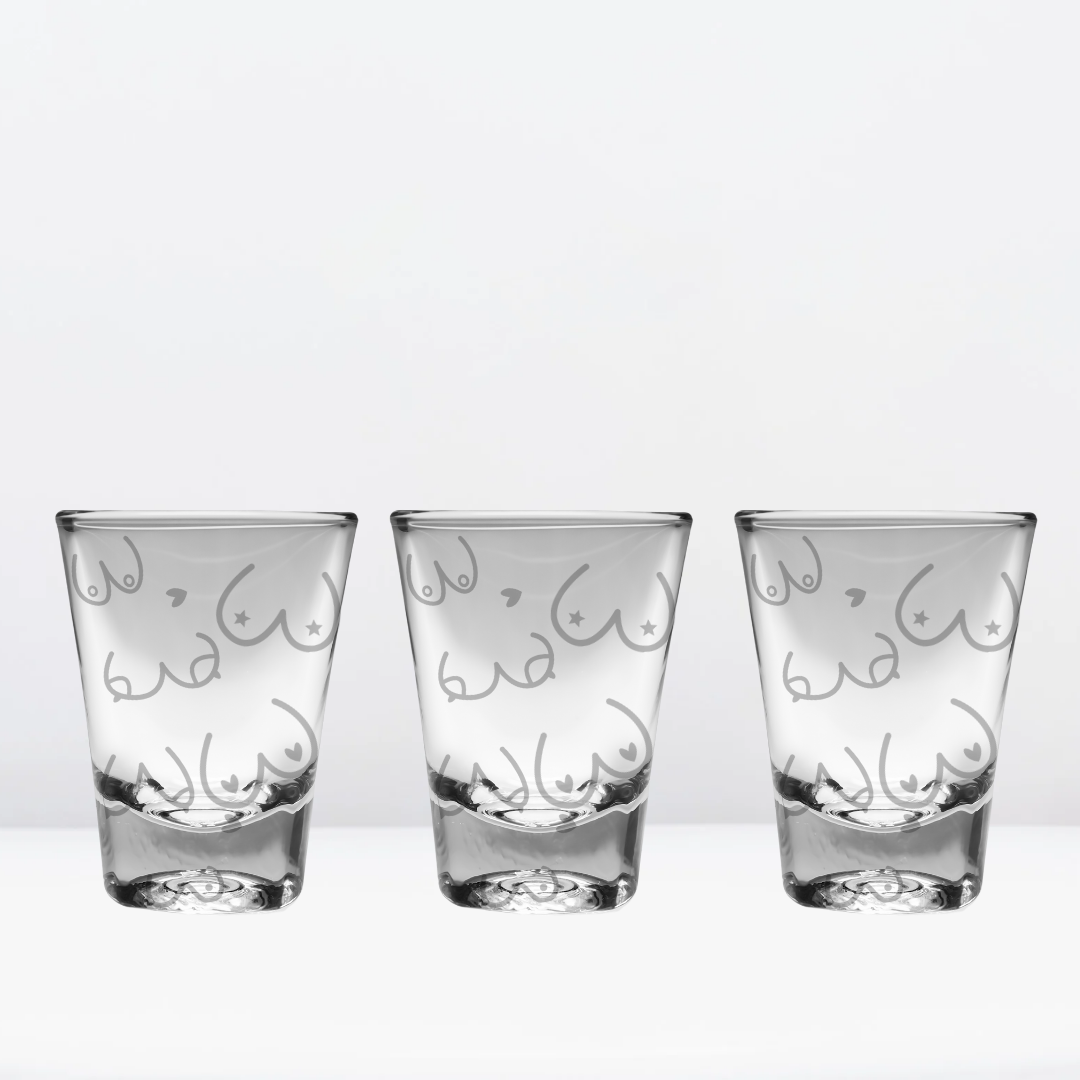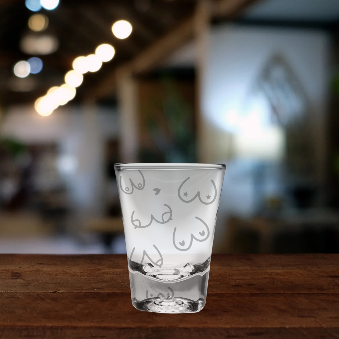 Introducing our 2oz shot glass – the "Boob Boost" edition! This cheeky little glass is perfect for those who want to add a touch of humor to their shots. With a hilariously subtle etching design, it's sure to bring smiles and giggles to your next party. Get ready to raise a toast and say, "Cheers to a good laugh and great shots!"