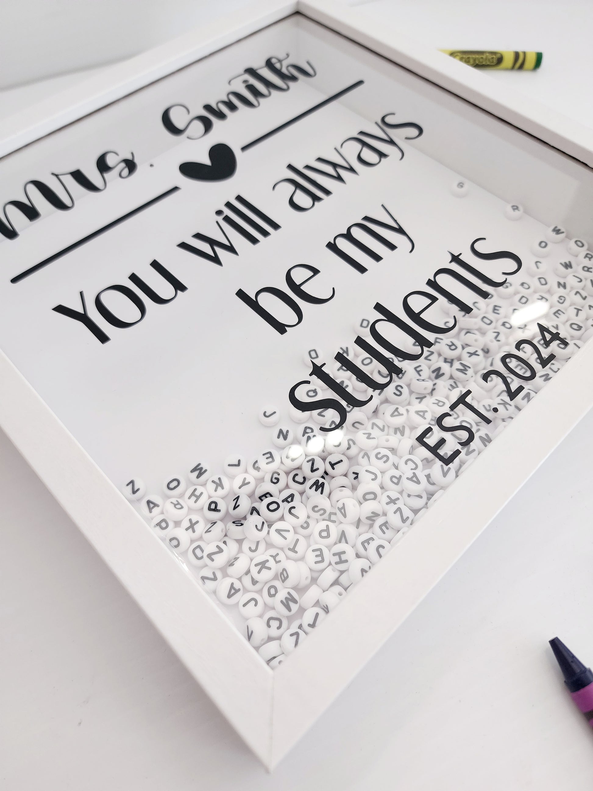 Each time a teacher welcomes a new student, they’ll add a letter bead with that student’s first name to the box. Over the years, the box becomes a beautiful visual record of their teaching journey and the countless young lives they’ve shaped.